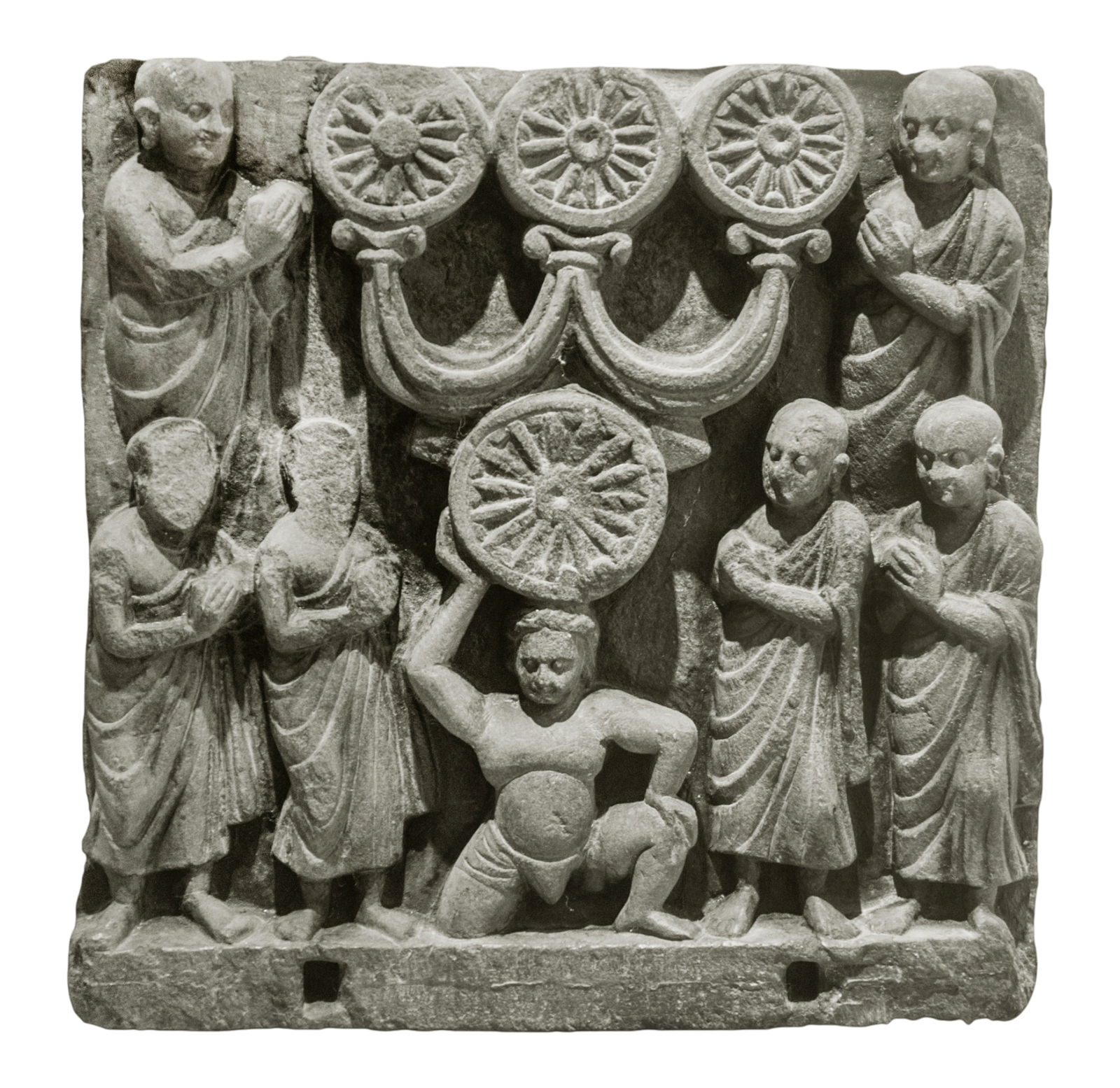 यह गांधार शिस्ट रिलीफ त्रि- रत्न, या तीन रत्नों—बुद्ध, धम्म और संघ की पूजा को दिखाता है। भक्तों और भिक्षुओं को प्र‍तीकात्‍मक चक्र आकृति के चारों ओर श्रद्धा वाले मुद्रा में दिखाया गया है, जो भक्ति और विश्वास पर ज़ोर देता है। पवित्र निशान को उठाए हुए बीच का व्यक्ति बौद्ध धर्म के सिद्धांत के लिए ईश्वरीय समर्थन दिखाता है। पूरा वस्‍त्र विन्‍यास, वास्‍तविक मुद्रा और कथात्‍मक स्‍पष्‍टता गांधार शैली par के ग्रीको यूनानी शैली के प्रभाव को दिखाता है