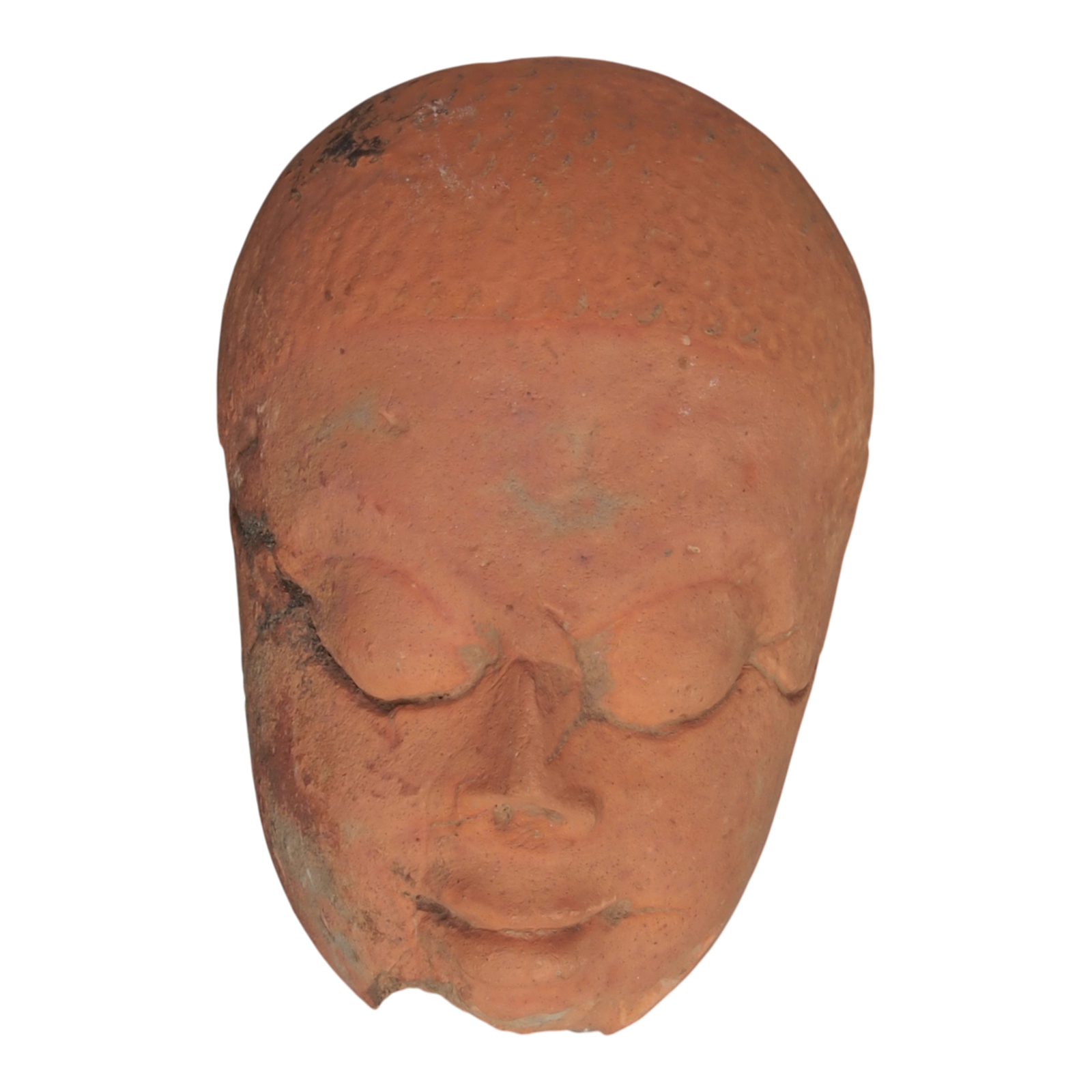 टेराकोटा (मृण्मूर्ति) से बने बुद्ध के शीर्ष, जो अक्सर अलग-अलग खंडों के रूप में प्राप्त होते हैं, शैलीगत प्रभावों और क्षेत्रीय कलात्मक अभ्यासों में मूल्यवान अंतर्दृष्टि प्रदान करते हैं। पिपरहवा से प्राप्त यह युवा बुद्ध शीर्ष अपने घुंघराले बालों, आधी बंद ध्यानस्थ आँखों और शांत अभिव्यक्ति से पहचाना जाता है। इसमें प्रमुख नाक, मोटा निचला होंठ और मुँह के हल्के कटाव से बनी कोमल मुस्कान को उल्लेखनीय संवेदनशीलता के साथ उकेरा गया है।