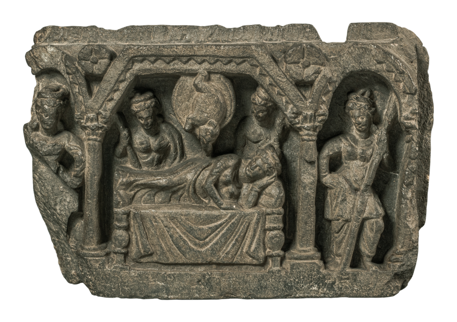 गांधार के ‘माया का स्‍वप्‍न’ रिलीफ में रानी माया देवी को एक पलंग पर लेटे हुए दिखाया गया है, जो तुशिता नामक एक सफेद हाथी- जो बुद्ध के चमत्‍कारी गर्भधारण का प्रतीक है, का स्‍वप्‍न देख रही हैं। ग्रे शिस्ट से बनी यह मूर्ति भारतीय और यूनानी शैली के कलात्मक मेल को दिखाती है, जिसमें क्लासिकल प्रकृतिवाद को बौद्ध कथाओं के विषयों से जोड़ा गया है। रानी के चारों ओर सेवक और दिव्य आकृतियाँ हैं, जो दृश्य के पवित्र महत्व को बढ़ाती हैं। यह रिलीफ गांधार कलाकारों के सुंदर, वास्‍तविक लगने वाले आकारों के जरिए गहनता से धार्मिक प्रतीकों को व्‍यक्‍त करने के कौशल को दर्शाती है।