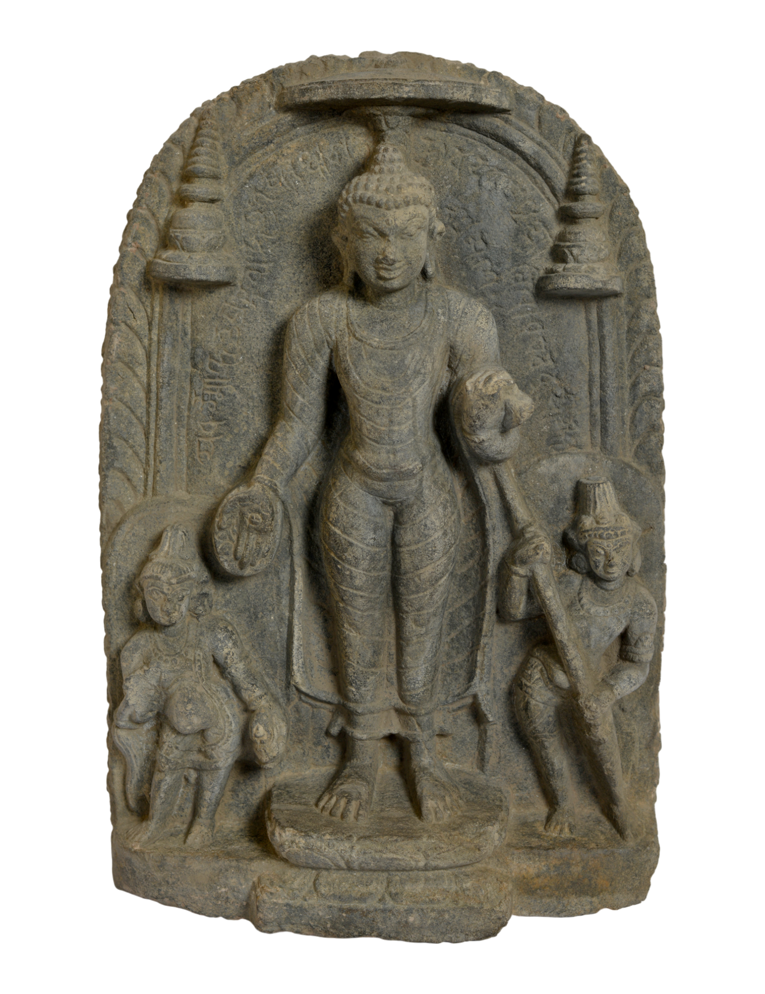 बुद्ध के जीवन की एक और ज़रूरी घटना स्वर्ग से तैंतीस देवताओं (त्रयस्त्रिंश) का उतरना है, जहाँ वे तीन महीने के लिए अपनी माँ को धर्म का उपदेश देने गए थे। इस मूर्ति में बुद्ध को सामने की ओर झुके हुए दिखाया गया है, उनका दाहिना हाथ वरदान देने की मुद्रा (वरद मुद्रा) में है। हिंदू देवता, ब्रह्मा और इंद्र, क्रमशः दाईं और बाईं ओर खड़े दिखाए गए हैं। ब्रह्मा चार मुँह वाले हैं और जटामुकुट से सजे हुए हैं और एक सज्जित छत्रावली पकड़े हुए हैं। उसी समय, इंद्र ने एक रत्नजड़ित मुकुट (किरीटमुकुट) पहना हुआ है और बुद्ध को भेंट चढ़ा रहे हैं।