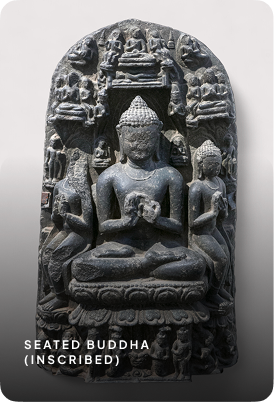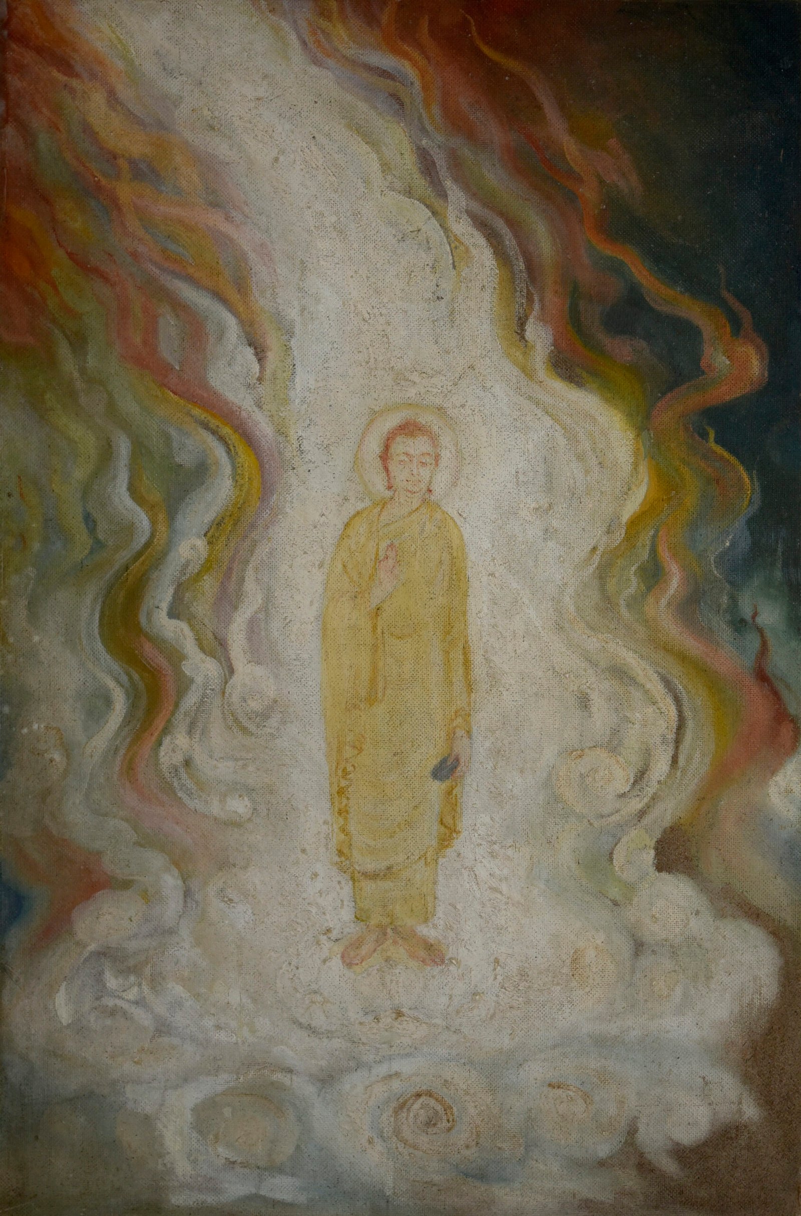 श्रावस्ती के चमत्कार को एक अनोखे रूप में, अग्नि से घिरे बुद्ध को अलौकिक सुंदरता और मन की शांति से युक्त दिखाया गया है। कलाकार ने बुद्ध की गहन शांति, जिसे नाज़ुक, आदर्श चेहरे और मुंदे हुए नेत्रों और गतिशील, लहरदार पृष्ठभूमि के साथ दिखाया है। यह कृति आकृति और अमूर्तता के बीच की रेखा को धुंधला कर देती है। हल्का फ़ोकस और रंगों की परतें इस कृति को एक काव्यात्मक अस्पष्टता देती हैं, जो सोचने पर विवश करती हैं।
