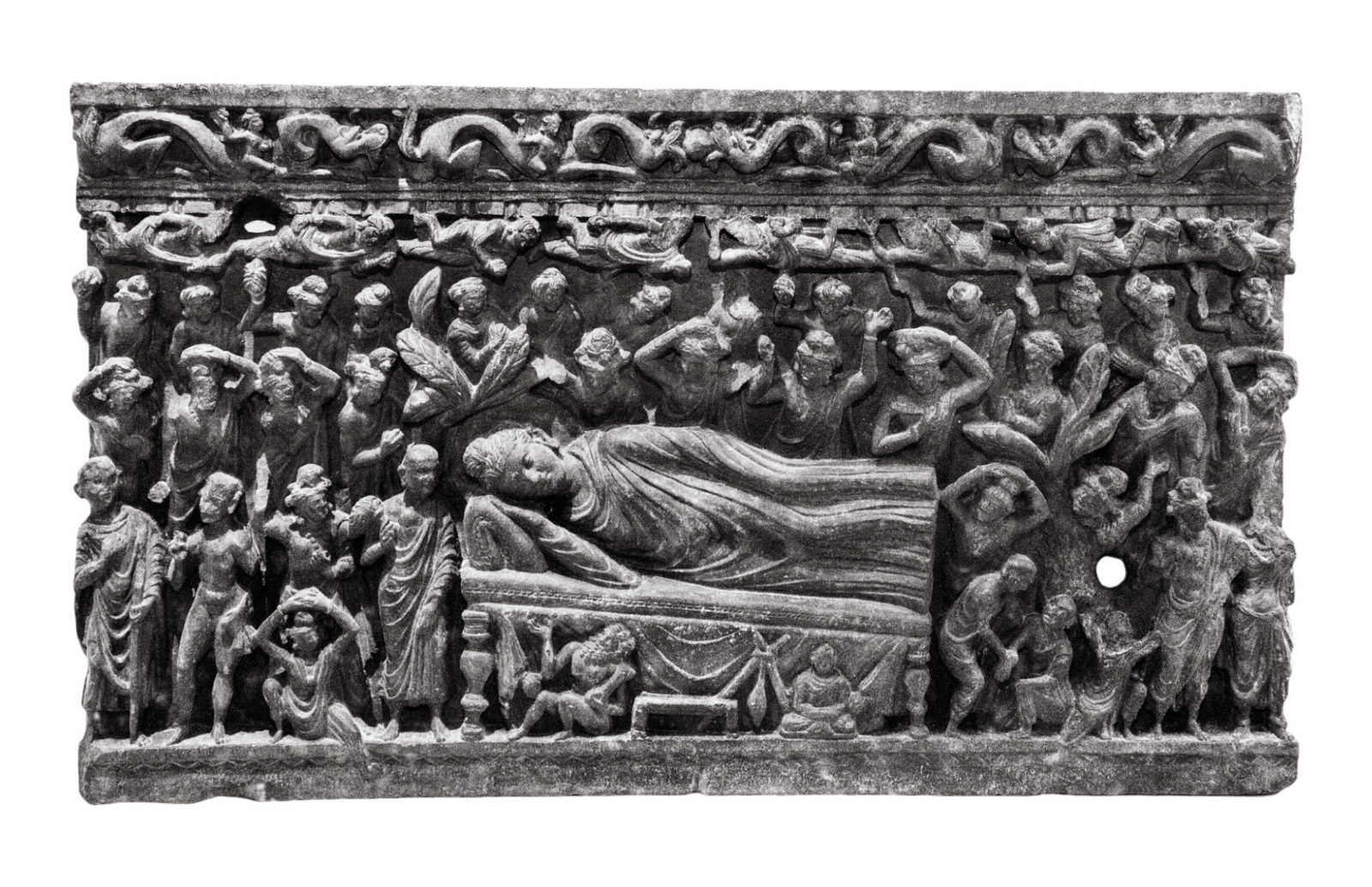 यह उभरा हुआ पैनल महापरिनिर्वाण को दिखाता है, जिसमें कुशीनगर में बुद्ध के गुज़रने को दिखाया गया है – संसार से उनकी मुक्ति। बुद्ध एक आसन पर शांति से लेटे हुए हैं, उनके चारों ओर दुखी शिष्य हैं— आनंद उनके पैरों के पास खड़े हैं, जबकि महाकाश्यप, सुभद्रा और वज्रपाणि पास में विलाप कर रहे हैं। वज्रपाणि, जिन्हें वज्र पकड़े हुए दिखाया गया है, एक समर्पित रक्षक के रूप में दिखाई देते हैं। यह पैनल शुरुआती बौद्ध अंत्येष्टि परंपराओं को दिखाता है, जो ऐसे रीति-रिवाजों के भारतीय मूल को दिखाता है।