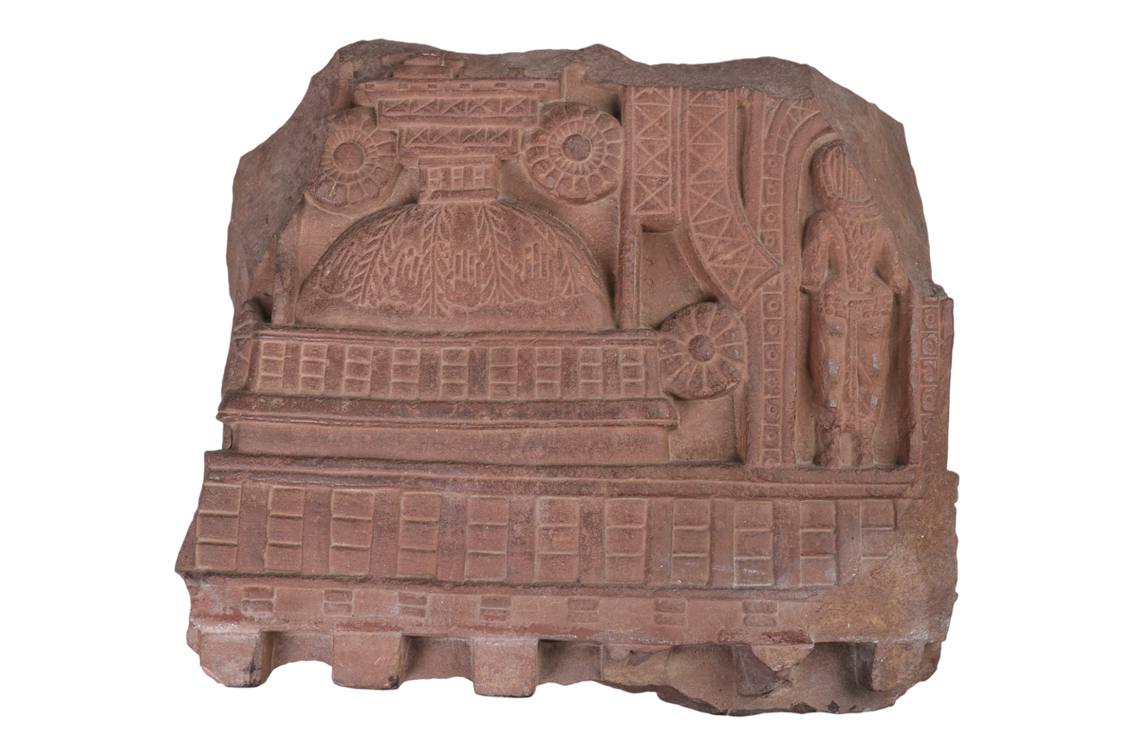 भरहुत के इस उभरे हुए टुकड़े में एक स्तूप है जो रेलिंग से घिरा है, और इसे लाल बलुआ पत्थर से बनाया गया है। सुसज्जित स्तूप टुकड़े के एक बड़े हिस्से पर है, जबकि लगभग एक-चौथाई जगह एक महिला भक्त के लिए है जो स्तूप के घेरे में परिक्रमा (प्रदक्षिणा) करने के लिए अंदर जाती है। वह चौड़ी रेलिंग के अंदर बने मेहराबदार दरवाजों में से एक से अंदर आती है, जो क्रॉसबार वाला है और जिसके ऊपर एक कोपिंग पत्थर लगा है। स्तूप के बीच में मिट्टी का एक कोर है, जिसके ऊपर बाहरी सतह पर एक हर्मिका है, जो एक्सिस मुंडी का प्रतीक है। यह टुकड़ा भरहुत और सांची में आमतौर पर पाए जाने वाले स्तूप आर्किटेक्चर के बारे में कीमती जानकारी देता है। इस चित्रण का एक ज़रूरी पहलू स्तूप पर की गई जटिल सजावट है; इसका आधा गोल गुंबद शुभ हाथ के निशानों से सजा है, जो अक्सर भरहुत में देखे जाते हैं। दो-मंज़िला हर्मिका से फूलों की लड़ियाँ लटकी हुई हैं, और स्तूप के दोनों ओर दो प्रमुख कमल के पदक हैं। महिला भक्त को शुंग काल के गुंधी हुई चोटी और सजे हुए बालों के साथ दिखाया गया है। वह एक धोती पहने हुए है जिसे एक करधनी (मेखला) से बांधा जाता है। पीछे से देखने पर, उसकी शारीरिक बनावट शुंग यक्षी जैसे की याद दिलाती है, जिसमें एक उभरा हुआ सिर, पतली कमर और एक मजबूत निचला शरीर होता है। उसकी बाहें कोहनी तक दिखाई देती हैं, जिससे पता चलता है कि स्तूप की परिक्रमा करते समय उसके हाथ प्रार्थना में जुड़े हुए हैं।