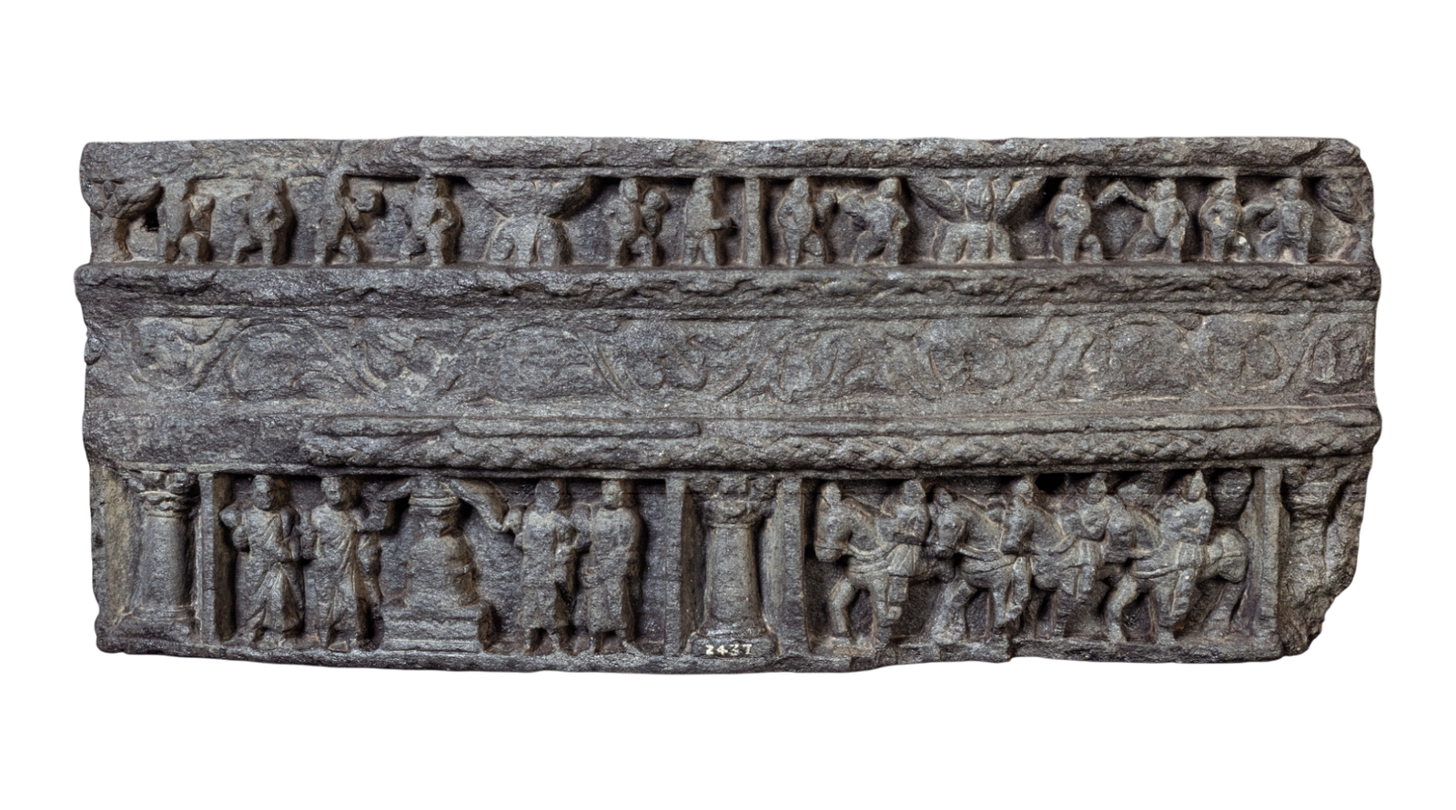 गांधार कला-शैली की ‘बुद्ध के भौतिक अवशेषों का परिवहन’ में बुद्ध के परिनिर्वाण के बाद उनके अवशेषों को ले जाते हुए एक पवित्र जुलूस दिखाया गया है। ग्रे शिस्ट में उकेरी गई इस नक्काशी में अनुयायियों और सेवकों को एक समाधि के पास जाते हुए दिखाया गया है, जिनके साथ राजसी लोग और संगीतकार भी हैं। बारीकी से दर्शाए गए वस्त्र, अभिव्यक्तिपूर्ण आकृतियाँ और वास्तु-परिवेष्टन इस कृति के गांधार यथार्थवाद को दर्शाती है और बुद्ध के अवशेषों को सुरक्षित रखने के पावन कर्तव्य पर बल देती है। यह कथारूपी नक्काशी भक्ति और आनुष्ठानिक भव्यता, दोनों को व्यक्त करती है, जो गांधार बौद्ध कला की विशेषता है।