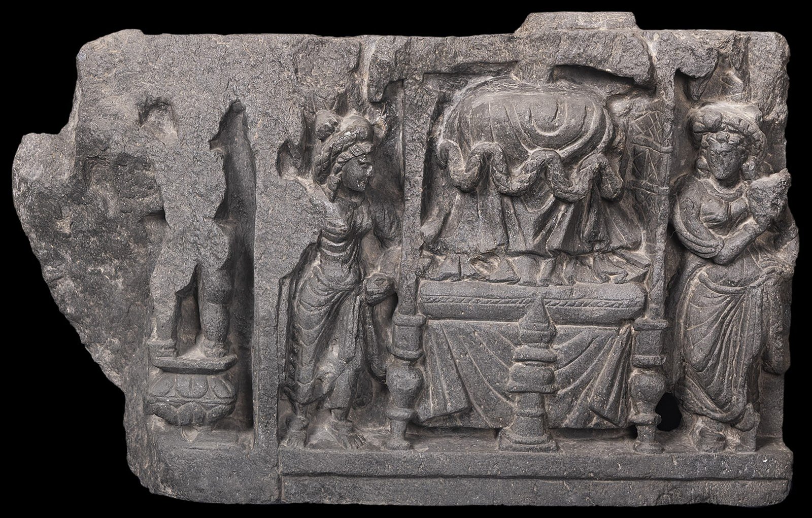 गांधार कला-शैली की ‘पुरावशेषों की पूजा’ रिलीफ़ में अनुयायियों को कपड़े से ढके एक रेलीक्वेरी स्तूप को श्रद्धांजलि देते हुए दिखाया गया है, जो बुद्ध के परिनिर्वाण के बाद उनकी सदा रहने वाली उपस्थिति का प्रतीक है। ग्रे शिस्ट में उकेरे गए इस दृश्‍य में सुंदर वस्‍त्र पहने लोग श्रद्धा से पुष्‍प अर्पित करते हुए और दिखाए गए हैं। उत्कृष्ट रूप से चित्रित आवरण और वास्तु-परिवेष्टन यूनानी -रोमन प्रभाव को दर्शाती है, जबकि मुख्य स्वरूप गहरी बौद्ध भक्ति दर्शाता है। यह रिलीफ़ गांधार कला के यथार्थवाद और आध्‍यात्मिकता के मिश्रण को दर्शाती है जो पवित्र पूजा पद्धतियों का प्रतीक है।