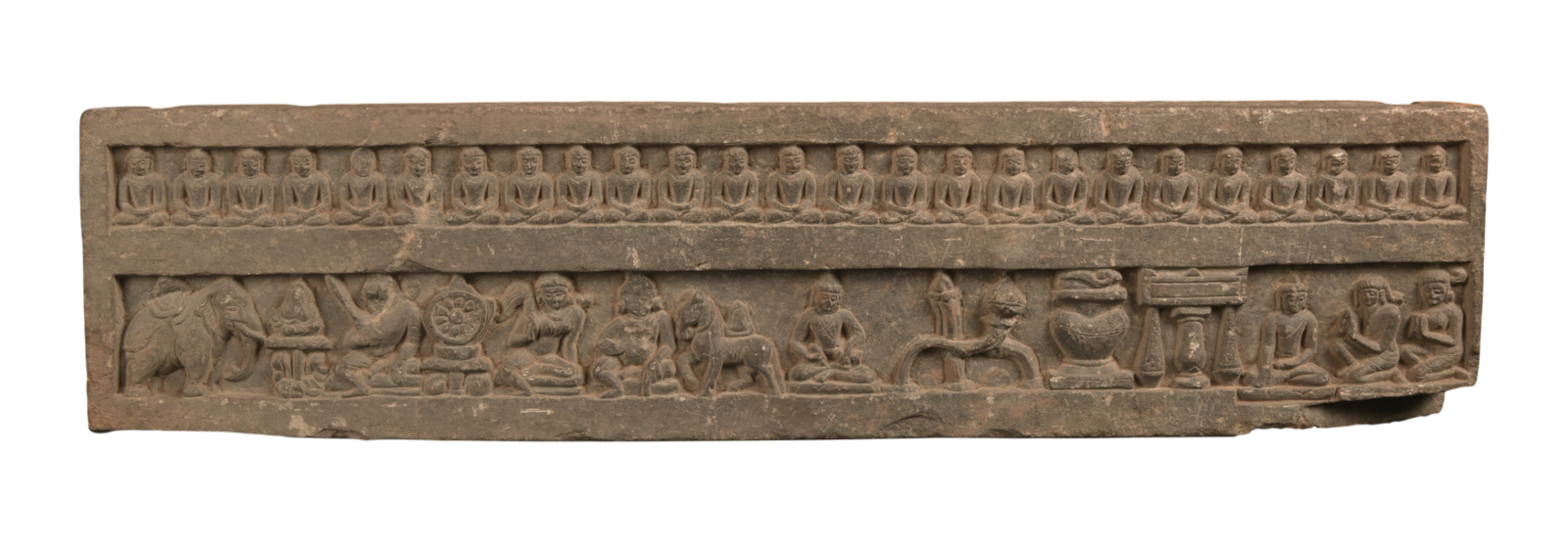 पाल शैली की यह पत्थर की नक्काशी सात रत्नों (सप्तरत्न) और पूजा की किताब को दिखाती है, जो बौद्ध धर्म में आध्यात्मिक और सासांरिक सत्ता के खास निशान हैं। पैनल में पहिया, हाथी, घोड़ा, रत्न, रानी, मंत्री और सेनापति शामिल हैं, जो एक दुनियावी शासक (चक्रवर्ती) की खूबियों को दिखाते हैं। ऊपर, बैठे हुए बुद्ध की पंक्तियाँ ज्ञान की लगातार बनी रहने की बात पर ज़ोर देती हैं। बारीक कारीगरी और संतुलित बनावट पाल वंश की कलात्मक खूबसूरती को दिखाती है, जिसमें धार्मिक निशानों को पत्थर की सुंदर नक्काशी के साथ मिलाकर बौद्ध राज और भक्ति का सार दिखाया गया है।