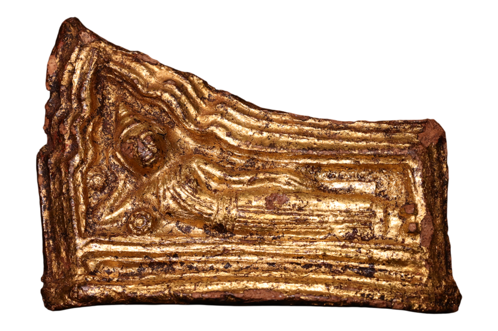 महापरिनिर्वाण की अवस्था में लेटे हुए बुद्ध को दर्शाने वाला सोने का पानी चढ़ा हुआ मन्नत पट्टिका बुद्ध के अंतिम पलों से जुड़ी मूर्तियों को उद्धृत करता है। यह विषय भारतीय और थाई मन्नत की कलाकृतियों में बड़े पैमाने पर दिखाया गया है, जो बौद्ध कहानी में इस महत्वपूर्ण घटना के आसपास के सांस्कृतिक महत्व और कलात्मक परंपराओं को प्रदर्शित करता है।