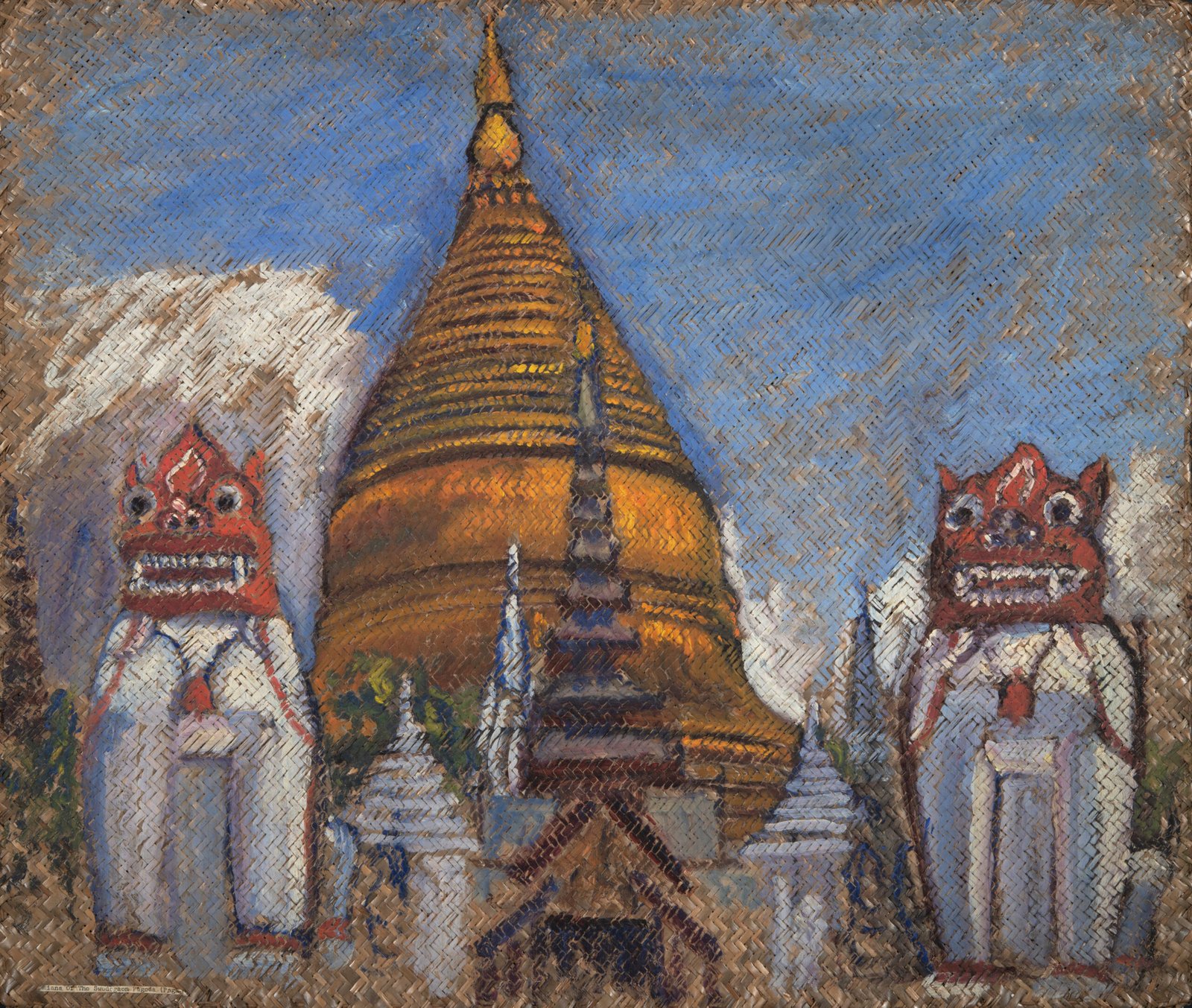 एलिज़ाबेथ ब्रूनर का चित्र म्यांमार के यांगून में मशहूर सुनहरे स्तूप की एक यादगार तस्वीर है,जिसके दोनों ओर पारंपरिक चिन्थे (शेर जैसी रक्षक आकृतियाँ) हैं।  यह कृति पवित्र जगह की विशालता और सुरक्षा प्रदान करने वाले वातावरण को दर्शाता है।