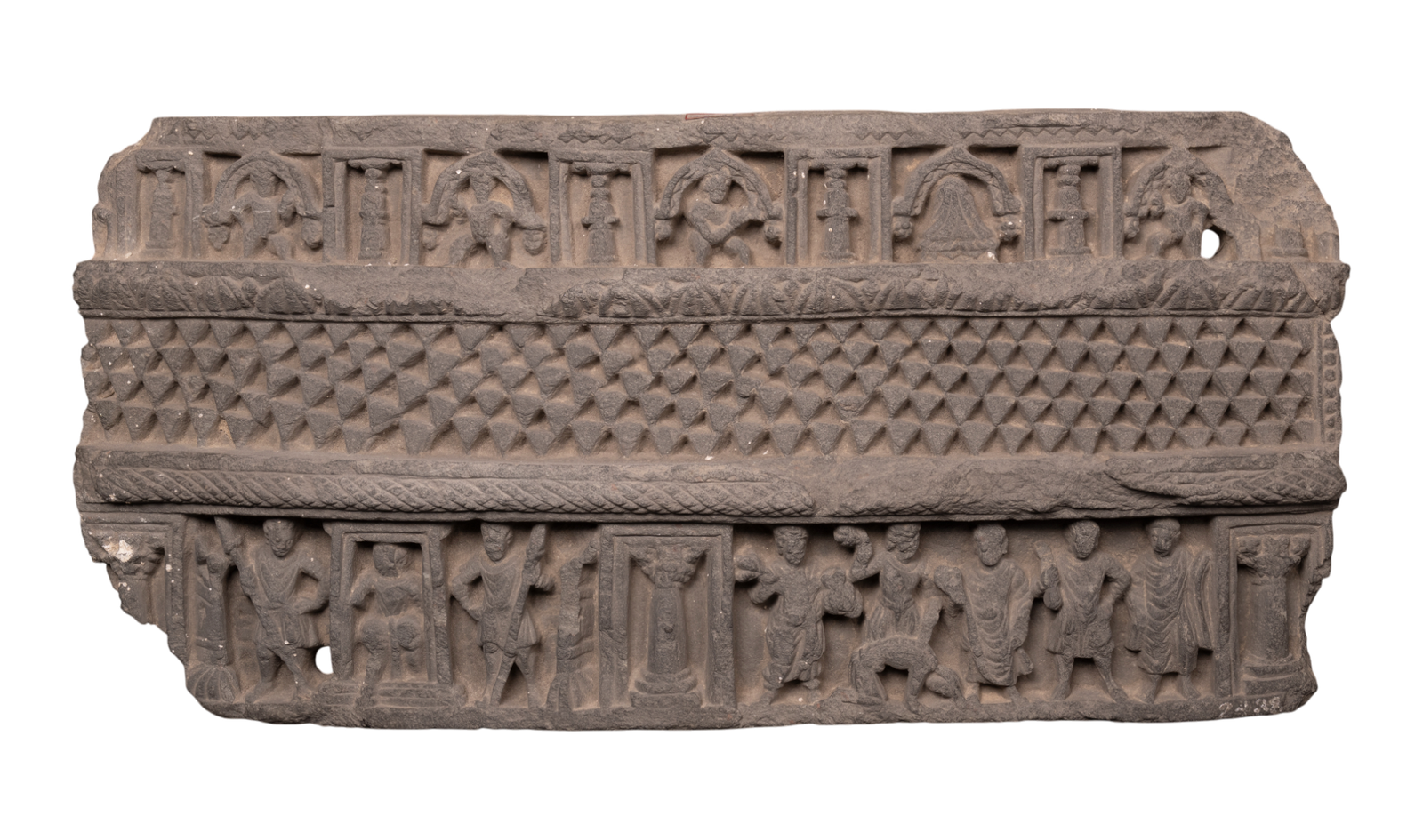 दूसरी सदी ई. की यह गांधार शिस्ट रिलीफ, दीपांकर जातक को दिखाती है, जो बुद्ध के पिछले जन्मों की सबसे पुरानी कहानियों में से एक है। इस दृश्य में दीपांकर बुद्ध को तपस्वी सुमेधा सम्मान दे रहे हैं, जो उनके सामने झुककर शाक्यमुनि बुद्ध के रूप में उनके भविष्य के ज्ञान की भविष्यवाणी कर रहे हैं। बीच के दृश्य के चारों ओर शानदार वास्तुशिल्पीय बनावट और साथ में बनी आकृतियाँ हैं, जो गांधार के यूनानी-बौद्ध कलात्मक मेल को दिखाती हैं। बारीक नक्काशी आध्यात्मिक वंश, दया और जीवन भर बौद्ध ज्ञान की निरंतरता को दिखाती है।