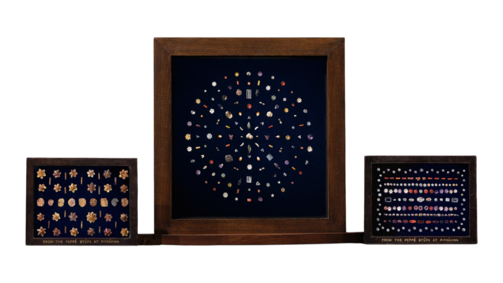 पिपरावा के बुद्ध अवशेषों को विलियम क्लैक्सटन पेप्पे ने 1898 में खोदकर निकाला था। ये रत्न, जिनमें कीमती पत्थर, सोने और चांदी के पत्तर, मोती और त्रिरत्न, पक्षी, पत्ती और कमल के रूपांकनों जैसे प्रतीकों में ढाले गए मनके शामिल थे, खुदाई के तुरंत बाद सावधानीपूर्वक तीन अलग-अलग फ्रेमों में शीशों के बीच जड़े गए […]